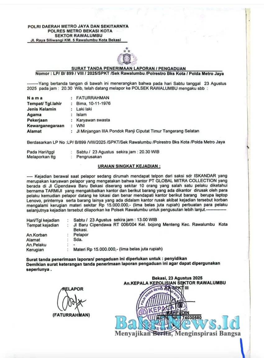 Bekasi – BahriNews.id | Aroma tak sedap menyeruak dari tubuh Polsek Rawalumbu. Publik mulai bertanya-tanya: ada apa dengan aparat penegak hukum di sana? Dugaan pembiaran bahkan beking terhadap aksi peremanisme kian mencuat, setelah laporan kasus perusakan kantor PT Global Mitra Collection (PT GMC) tak kunjung digarap serius.