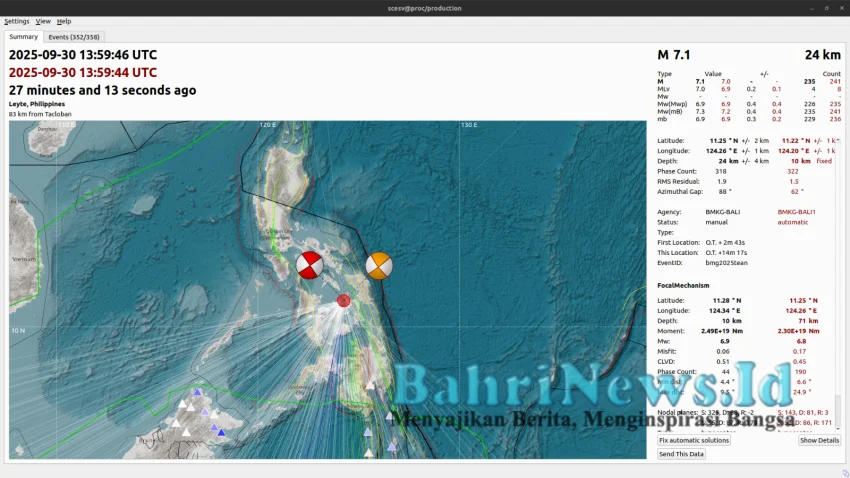 BahriNews.id | Jakarta – Selasa malam, 30 September 2025 pukul 20:59:43 WIB, wilayah Calape, Filipina diguncang gempabumi tektonik berkekuatan Magnitudo 6,9. Berdasarkan hasil analisis BMKG, pusat gempabum