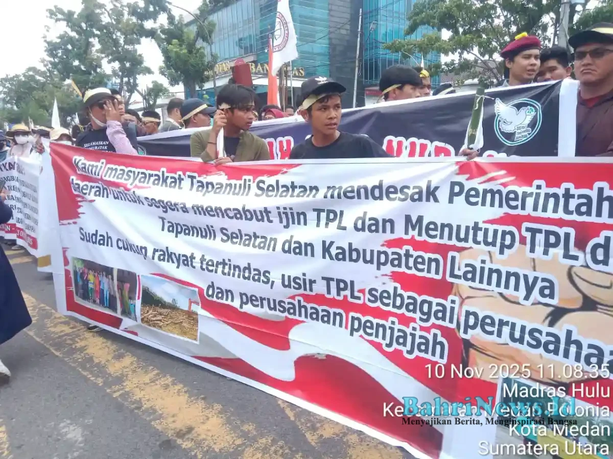 BahriNews.id | Medan — Teriakan “Tutup TPL!” menggema di depan Kantor Gubernur Sumatera Utara, Senin (10/11/2025). Ratusan massa dari berbagai elemen masyarakat Batak mengepung kantor pemerintahan itu menuntut Gubernur Bobby Nasution bertindak tegas terhadap PT Toba Pulp Lestari (TPL), perusahaan yang dituding menjadi biang penderitaan masyarakat adat.